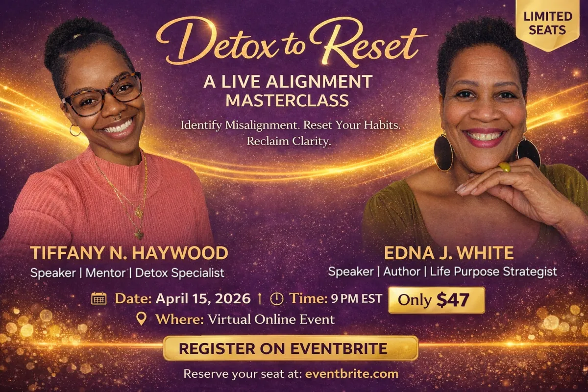 Details: In this live masterclass, Tiffany and Edna combine their expertise in personal transformation, mindset, and life purpose to guide you through a practical and reflective process that helps you reset from the inside out. Together, they will help you examine the habits, beliefs, and patterns that quietly keep people stuck, overwhelmed, or disconnected from the life they truly want to live.